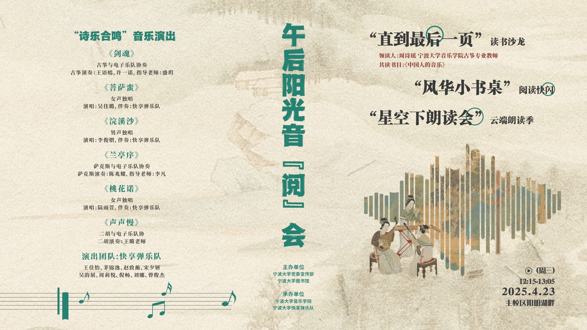 春风共展书间韵,新芽轻和曲中诗。4月23日正值世界读书日,学校将举行午后阳光音“阅”会专场演出,欢迎广大师生前往观看。